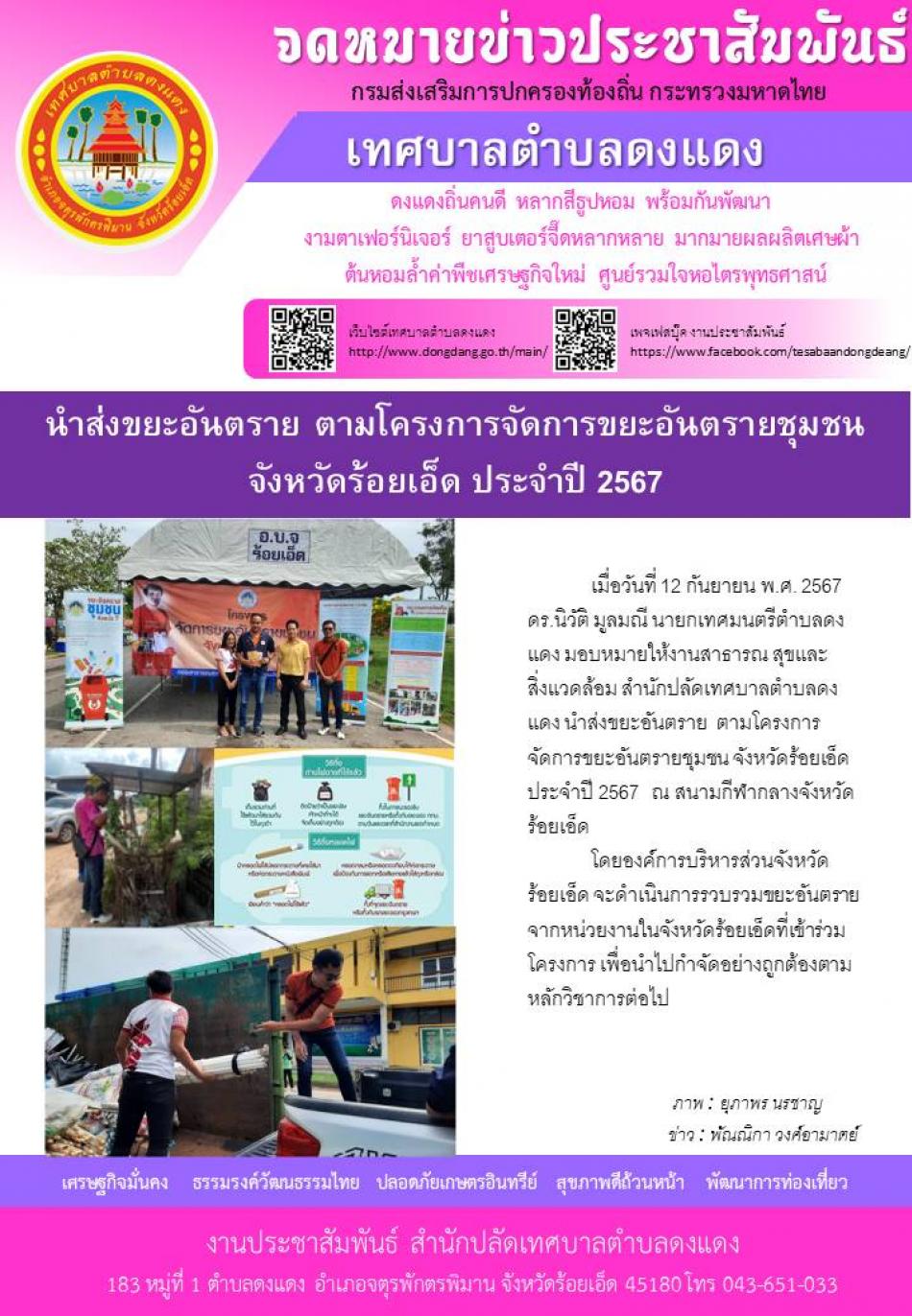 นำส่งขยะอันตราย ตามโครงการจัดการขยะอันตรายชุมชน จังหวัดร้อยเอ็ด ประจำปี 2567 [12 กันยายน 2567]