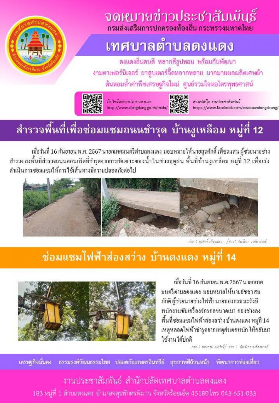 กองช่างลงพื้นที่สำรวจถนน และซ่อมแซมไฟฟ้า [16 กันยายน 2567]