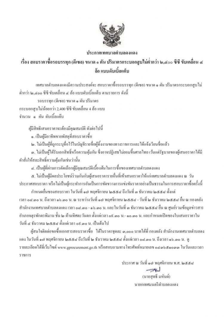สอบราคาซื้อรถบรรทุก (ดีเซล) ขนาด ๑ ตัน ปริมาตรกระบอกสูบไม่ต่ำกว่า ๒,๔๐๐ ซีซี ขับเคลื่อน ๔ ล้อ แบบดับเบิ้ลแค็บ
