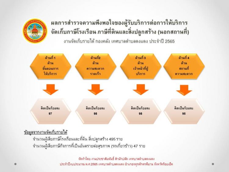 ผลการสำรวจความพึงพอใจของผู้รับบริการต่อการให้บริการ จัดเก็บภาษีโรงเรือน ภาษีที่ดินและสิ่งปลูกสร้าง (นอกสถานที่) งานจัดเก็บรายได้ กองคลัง เทศบาลตำบลดงแดง ประจำปี 2565