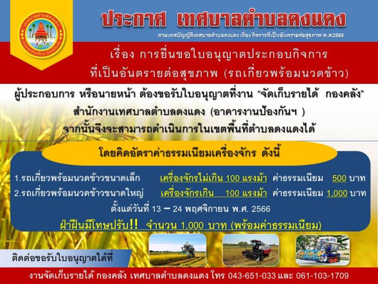 เรื่อง การยื่นขอใบอนุญาตประกอบกิจการ ที่เป็นอันตรายต่อสุขภาพ (รถเกี่ยวพร้อมนวดข้าว)