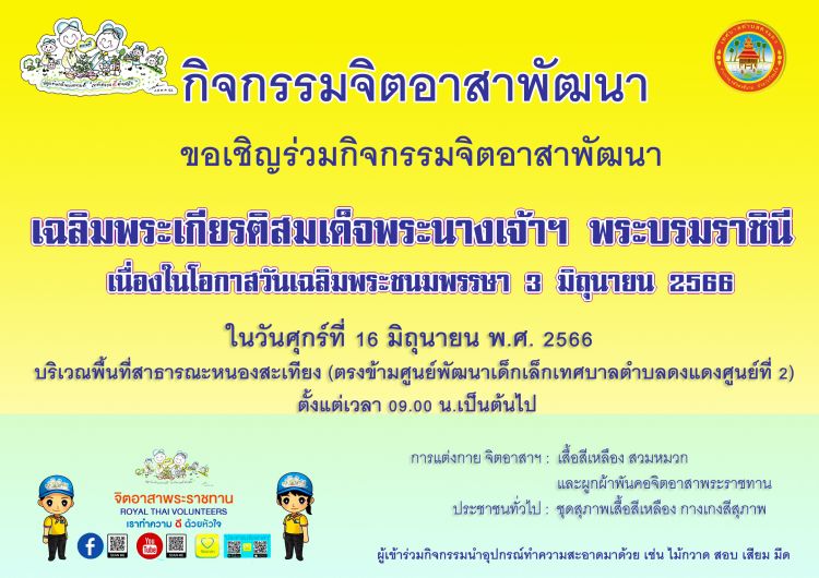 ชื่อเรื่อง : ขอเชิญร่วมกิจกรรมจิตอาสา เนื่องในโอกาสวันเฉลิมพระชนมพรรษา 3 มิถุนายน 2566