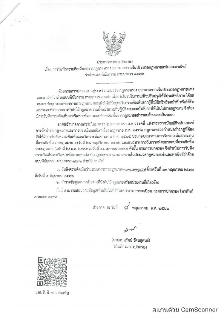 ประกาศการรับฟังความคิดเห็นต่อร่างกระทรวง ออกตามความในประมวลกฎหมายแพ่งและพาณิชย์ว่าด้วยแบบพินัยกรรม ตามมาตรา 1672