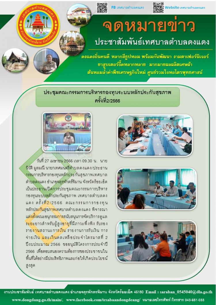รายละเอียด : วันที่ 27 เมษายน 2566 เวลา 09.30 น. นายนิวัติ มูลมณี นายกเทศมนตรีตำบลดงแดง/ประธานกรรมการบริหารกองทุนหลักประกันสุขภาพเทศบาลตำบลดงแดง อำเภอจตุรพักตร์พิมาน จังหวัดร้อยเอ็ด เป็นประธานเปิดการประชุมคณะกรรมการบริหารกองทุนระบบหลักประกันสุขภาพ เทศบาลตำบลดงแดง ครั้งที่2/2566 คณะกรรมการกองทุนหลักประกันสุขภาพเทศบาลตำบลดงแดง พิจารณาแต่งตั้งคณะอนุกรรมการสนับสนุนการจัดบริการดูแลระยะยาวสำหรับผู้สูงอายุที่มีภาวะพึ่งพิง รับรองรายงานสถานะการเงิน รายงานการรับเงิน การจ่ายเงิน และเงินคลเหลือประจำไตรมาส 2 ปีงบประมาณ 2566 ขออนุมัติโครงการประจำปี 2566 เพื่อตอบสนองความต้องการของประชาชนในพื้นที่ได้อย่างมีประสิทธิภาพและก่อให้เกิดประโยชน์สูงสุด