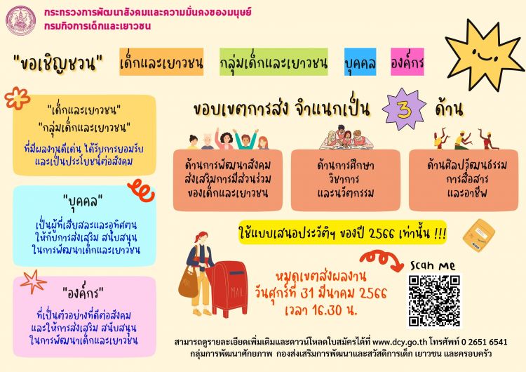 ชื่อเรื่อง : ประชาสัมพันธ์ การสรรหา พิจารณา คัดเลือก ประกาศ ยกย่องและเยาวชนดีเด่นแห่งชาติ และผู้ทำคุณประโยชน์ต่อเด็กและเยาวชน ประจำปี 2566