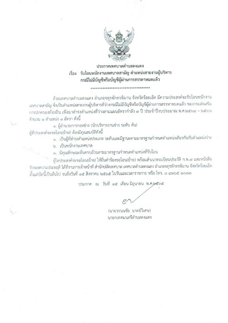 ประกาศ รับโอนพนักงานเทศบาลสามัญ ตำแหน่งสายงานบริหาร กรณีไม่มีบัญชีหรือบัญชีผู้ผ่านการสรรหาหมดแล้ว
