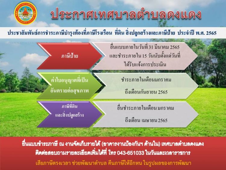 เรื่องประชาสัมพันธ์การออกให้บริการรับชำระภาษีที่ดินและสิ่งปลูกสร้าง ภาษีป้าย ประจำปีงบประมาณ พ.ศ.2565