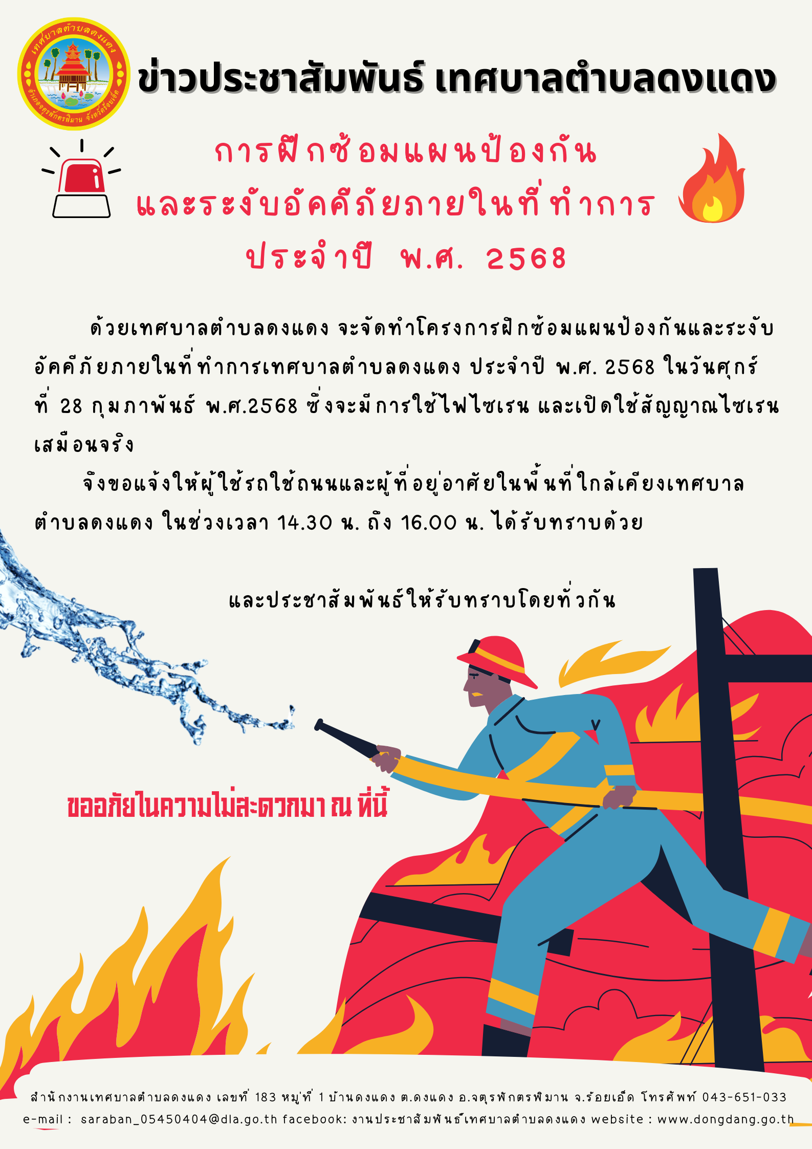 ชื่อเรื่อง : ประชาสัมพันธ์ การฝึกซ้อมแผนป้องกันและระงับอัคคีภัยภายในที่ทำการเทศบาลตำบลดงแดง ประจำปี พ.ศ. 2568 ในวันศุกร์ ที่ 28 กุมภาพันธ์ พ.ศ.2568