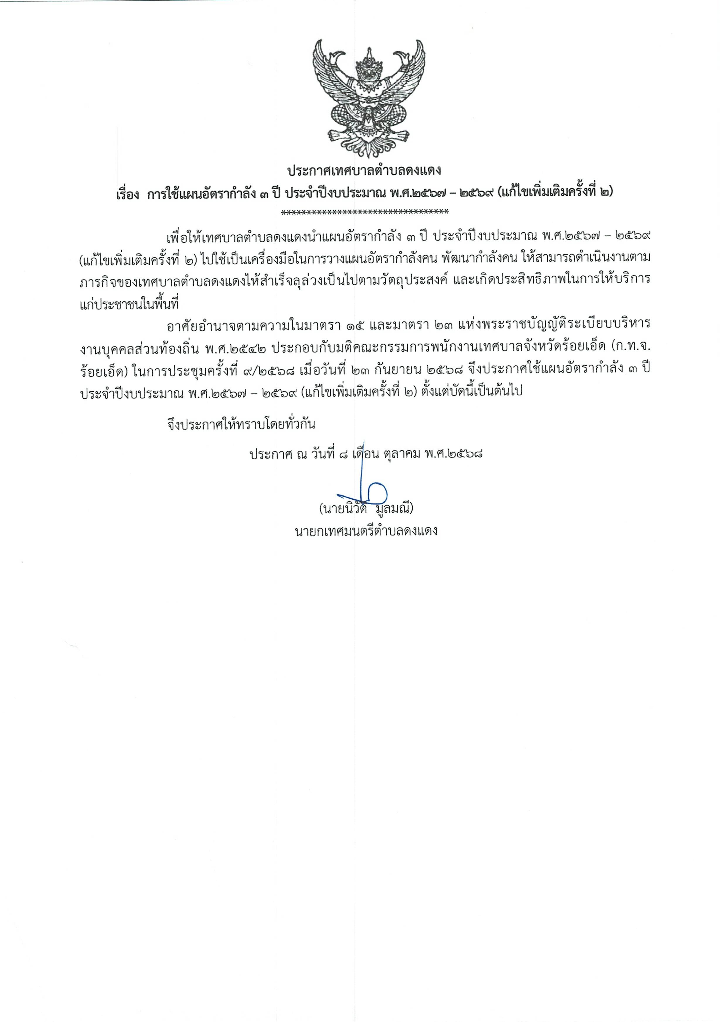 ชื่อเรื่อง : ประกาศเทศบาลตำบลดงแดง เรื่องการใช้แผนอัตรากำลัง 3 ปี ประจำปีงบประมาณ พ.ศ. 2567-2569 (แก้ไขเพิ่มเติมครั้งที่ 2)